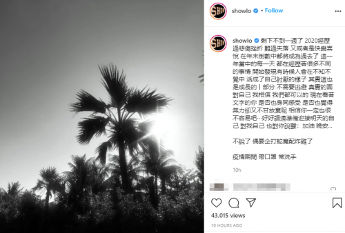 文中,罗志祥感叹,“2020经历过悲伤挫折、难过失落,又或者是快乐喜悦,在年末倒数中都将成为过去了。”他坦言,这一年当中的每一天,都在经历着很多不同的事情,“开始发现有时候人会在不知不觉中,活成了自己讨厌的样子,其实这也是成长的一部分,不需要逃避,真实的面对自己,我相信,我们都可以的。”