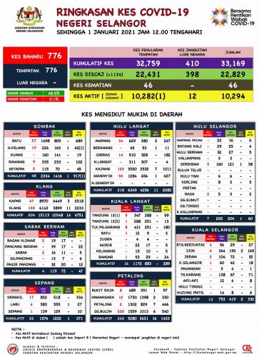 雪州全国最高确诊病例 1 Jan , 2021 | 民生关注 (吉隆坡1日讯)雪州今日再次成为全国最高确诊病例州属,共有776宗新增病例! 根据雪州卫生局数据,截至今日(1日)中午12时,州内共报有776宗确诊,全是本土感染,无境外输入病例。 州内最严重县属是八打灵县,有242宗。其他县依序为乌鲁冷岳县218宗、巴生县216宗、鹅唛县48宗、雪邦县22宗、瓜拉冷岳县16宗、瓜拉雪兰莪县13宗、乌鲁雪兰莪7宗及沙白安南县4宗。 各县的确诊参考下列图表: 分享