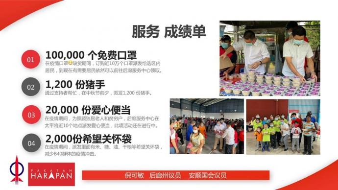 行动党太平后廊州议员倪可敏发表2020年选区服务成绩单,列举16项政绩,当中包括赠送1200个猪手、10万个口罩、2万个便当、2000份日常食品福袋给选民。
