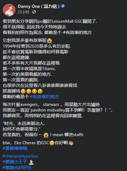 【特别报道】在LeisureMall 广场经营了26年的GSC电影院迎来了关闭的消息,这对于许多人来说是充满着回忆的地方,就连本地艺人Danny温力铭也不舍发文纪念。