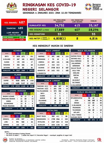 根据雪州卫生局的数据,截至今日中午12时,有685宗本土感染病例,2宗境外输入病例,累计病例达3万5167宗。今日有1960人痊癒出院,累计痊愈2万8296宗(占80.3%)。州内活跃病例大幅减少至6816宗。死亡病例有55宗,死亡比率0.2%。