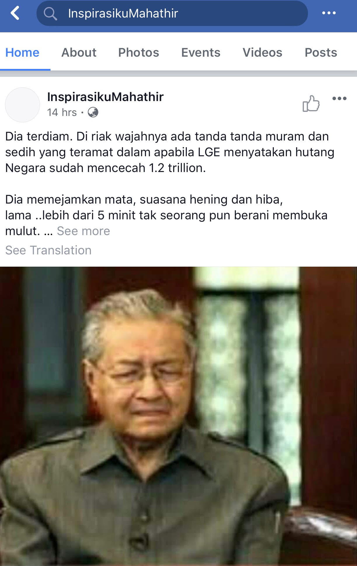 “InspirasikuMahathir”专页周六撰文说,马哈迪在会议上,从财政部长林冠英口中得知国债有1.2兆令吉后,闭上沉默长达7分钟。