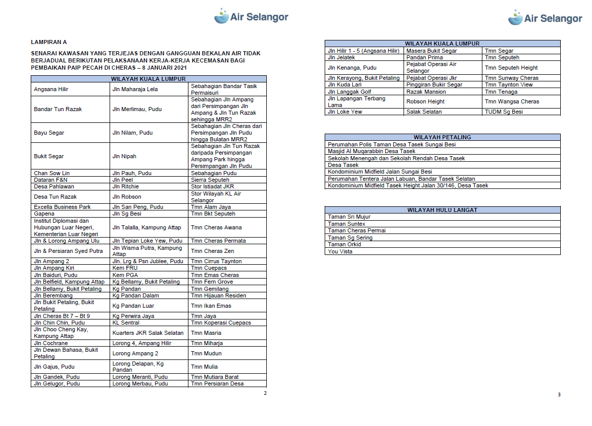 蕉赖大断水! 8 Jan , 2021 | 民生关注, 民生百事 Air Selangor公司通知,由于第三方工程施工导致水管破裂,蕉赖大断水! 受影响地区涵盖吉隆坡、八打灵县和乌冷县的121区,囊括了绝大部分的蕉赖地区。 “Jalan Sering的工程导致水管破裂,水供系统即时中断,预计明日凌晨3时能全面恢复供水。” 用户受促储水备用,并可浏览www.airselangor.com,AIR SELANGOR脸书、推特、IG,或致电15300热线查询。 分享