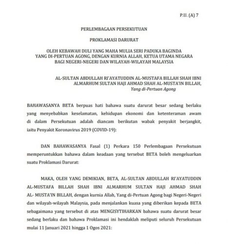 “朕,苏丹阿都拉,在阿拉的恩典下,作为大马州属和联邦直辖区的国家元首,行使赋予朕的权力,基于国家发生大型紧急事件而宣布进入紧急状态,而该紧急状态从2021年1月11日起至8月1日,涵盖整个联邦。”