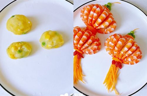 5)土豆泥团成半圆放入盘中,摆上虾仁,胡萝卜豌豆粒枸杞装饰