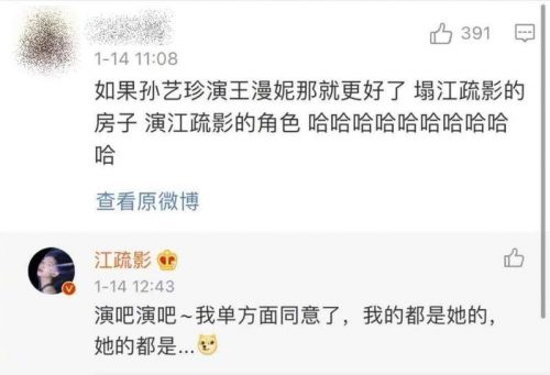 万万想不到江疏影亲自回覆该网友留言:“演吧演吧!我单方面同意了,我的都是她的,她的都是……”,搞笑指孙艺珍的男友玄彬是自己的,真的是迷妹无误!