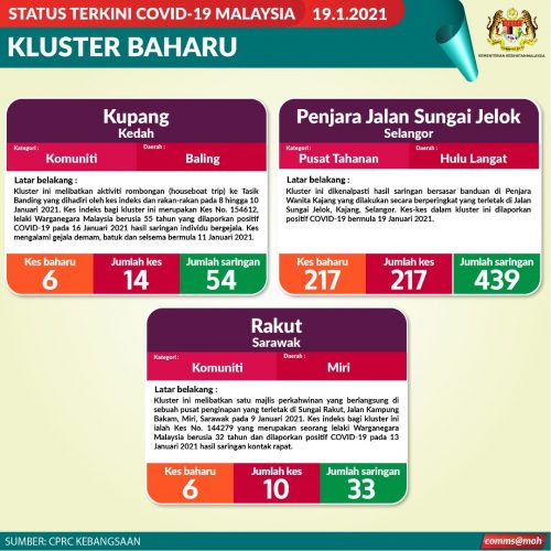此外,217宗来自新的感染群(Penjara Jalan Sungai Jelok),即落在雪州加影双溪直落的女子监狱,这个感染群连续爆發多宗确诊。