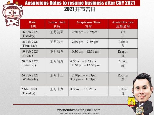 风水老师Raymond Wong黄荣晖为大家列出了2021牛年开工吉日、吉时!各位老板、员工可以留意一下,因为有些日子,有的生肖或会犯冲!