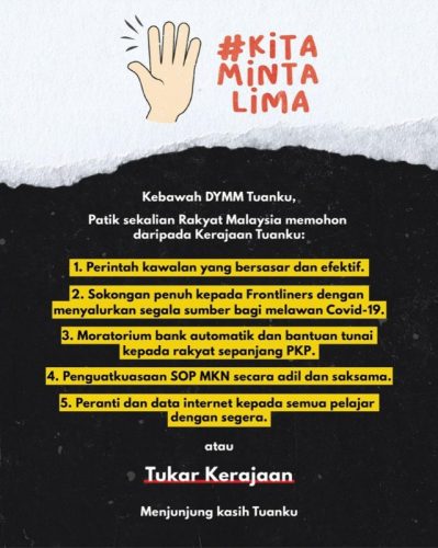 这个由网民在推特上发起#KitaMintaLima标签运动,向国家元首苏丹阿都拉陛下提出五大诉求,若这些诉求无法实现,则要求撤换政府。