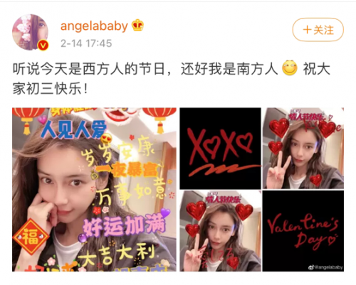黄晓明和Angelababy(杨颖)结婚5年,屡出婚变,然则两人近日关系冷淡,baby甚至不帮黄晓明过生日,两人出席各活动也不提彼此,如今随着情人节的到来,两人动向引人好奇,baby今日突然以幽默口气发文,“听说今天是西方人的节日,还好我是南方人,祝大家初三快乐”,并且用APP后制了许多特效文字,其中有身体健康、岁岁安康、大吉大利、万事如意等,充满了过年气息,但提到自己不过情人节,仍引人好奇。