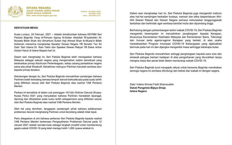 陛下:紧急状态仍可召开国会! 24 Feb , 2021 | 民生关注 国家元首苏丹阿都拉陛下认为,紧急状态下,仍然可以召开国会! 国家王宫总管阿末法迪尔发文告指出,陛下今天接见了上议院主席莱士雅丁及下议院议长阿兹哈,表达了上述观点。 文告指出,紧急状态期间,国家元首仍可在首相的劝告下,谕令择定适当的日期召开国会会议。 “某方面人士认为颁布紧急状态,是要阻止召开国会,是不正确的。” 分享