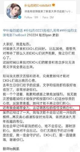 最后灿烈也直言自己会竭尽全力,证明“各位对我的信任没有白付。”而今年也是他出道第9年,最后他再度说自己不会忘记9年前出道时的初衷,也会好好守护大家给予的爱。最后则是祝福大家身体健康。文章曝光后,立刻引发讨论,有网友认为这可能是他即将回归的前奏。