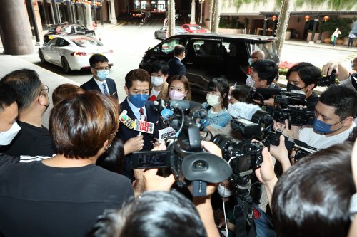 郭富城和经理人小美在中午时到场,于今日12时15分到场,郭富城表示与一对新人都有渊缘,与新郎新娘分别有合作过:“汤怡之前《寒战》做我秘书,衷心祝福他们。礼物方面我都继续给红包啦,他们想买什么就买什么,也知道他们有了宝宝,到时如果想聊爸爸经都可以分享一下。”讲到新郎时,郭富城说:“看着麦秋成成长,他曾帮助我,如今已成为排舞师,今天大日子当然要来恭喜他们。”