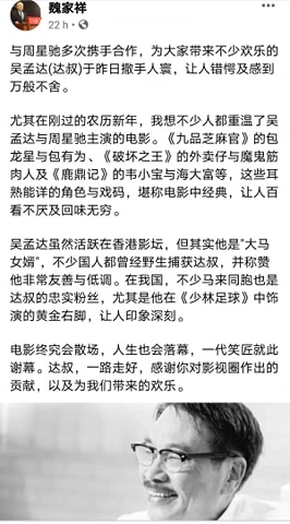 他PO图配文写到,“与周星驰多次携手合作,为大家带来不少欢乐的吴孟达(达叔)于昨日撒手人寰,让人错愕及感到万般不舍。