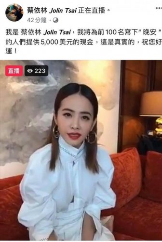 据台湾媒体报道,近来社群网站上的诈骗行为猖獗,包括蔡依林、潘玮柏、田馥甄等歌手,都出现了盗版的脸书帐号,透过假直播及私讯等方式进行诈骗,还会以艺人的身分,称要提供美元现金给歌迷。蔡依林4年前参加派对的直播片段,也被拿来以同样手法进行诈骗,若歌迷一不小心点取连结就会中招。