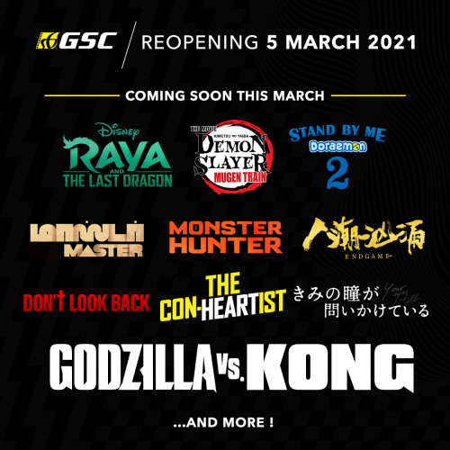根据GSC官方所PO出的照片中,至少10部电影已经确定上映,如《人潮汹涌》、《Don’t look back》、《Godzilla VS Kong》、《Raya And The Last Dragon》、《Monster Hunter》、《Stand By Me哆啦A梦2》、《鬼灭之刃无限列车篇》等。