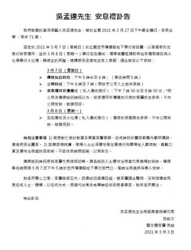 讣告中表示,为对吴孟达的敬重及尊重家属意愿,任何时段于灵堂范围内严禁摄录,因应疫情,进场人士必须遵守场地人数限制、佩戴口罩及遵守治丧处防疫安排,更表示违者将逐出灵堂。田启文透露,当天也会有专门安排采访时段,将有家属代表接受访问。请各采访人士遵守治丧处代表现场的安排。
