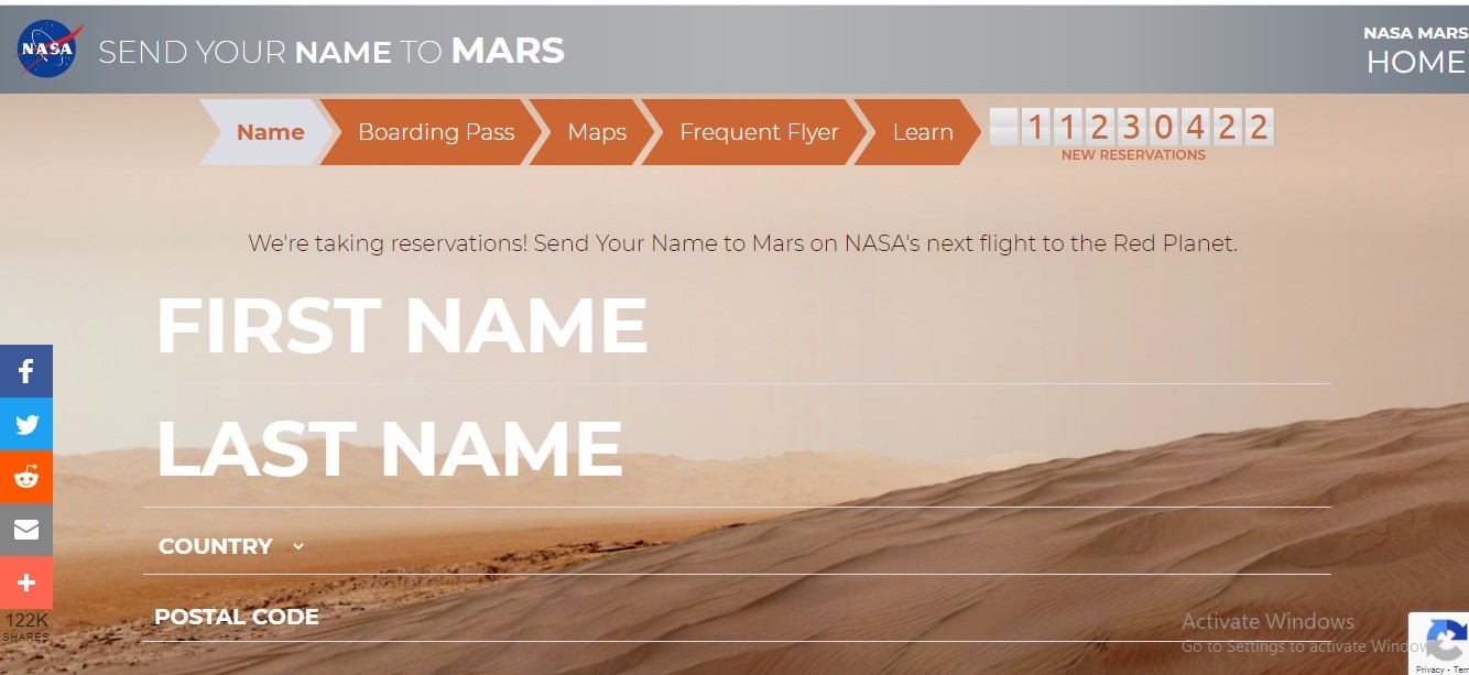 美国太空总署NASA开放了“Send your name to mars计划”,让全世界每个人都有机会在2026年将自己的名字随着太空船登陆火星。