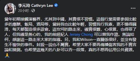 她突然修改贴文,承认自己当年做事不够圆滑而制造出许多误会:“当年初期接触演艺界,尤其到中国,其实很不习惯。这个行业需要参与比较多的应酬、饭局、酒局等,当时我也比较年轻,习惯我行我素,更不懂得圆滑,每天都制造很多误会。”