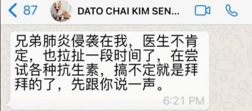 魏家祥出示信息截图,蔡金星表示受肺炎侵袭了一段时间,医生也不确定情况,只能尝试各种抗生素,万一搞不懂就拜拜了。