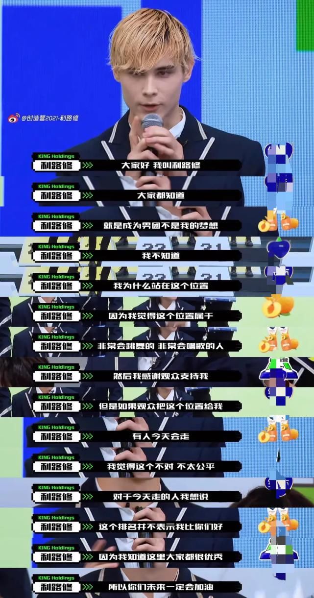他拿起麦克风发表感言直接放话:“成为男团不是我的梦想,我不知道我为什么站在这个位置,因为我觉得这个位置属于非常会跳舞唱歌的人,我感谢观众给我的支持,但是观众把这个位置给我,我觉得这个不太公平,对于今天走(被淘汰)的人我想说,这个排名并不表示我比你们好,因为我知道这里大家都很优秀”,最后还不忘“祈求”大家别再为他投票!