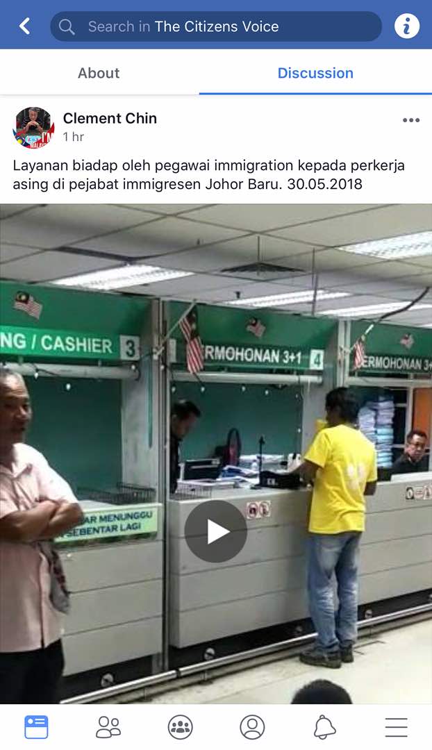 一名网民把一段9秒视频上载至面子书专页”The Citizens Voice”,该帖文题清楚注明柔佛新山移民局官员恶劣对待外劳,以及附上2018年5月30日。