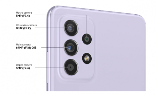 配备四摄镜的Galaxy A52采用具备OIS光学防震设计的6400万像素广角镜头、1200万像素超广角镜头、500万像素景深镜头和500万像素微距镜头,前置镜头则为3200万像素!