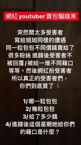 值得一提的是,另一名网红“姐姐”Leng Yein碰巧在这期间发布了一张图,标题是“网红youtuber卖包骗钱案”,文中写到:“突然间太多受害者写给姐姐同样的遭遇,同一粒包包不同价钱卖给了很多粉丝,进钱后受害者不被回覆/被给一堆不同借口等等。然后网红扮受害者”。