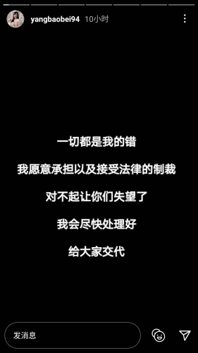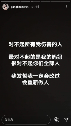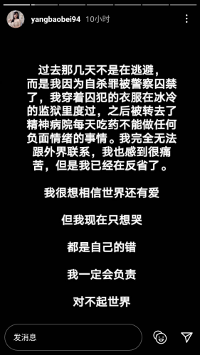 杨宝贝一连发了好几条动态,一开始她先向大家道歉,承认自己做错愿意承担后果以及接受法律制裁,随后她也解释自己这几天因为自杀罪被警察囚禁,“我穿着囚犯的衣服在冰冷的监狱里度过,之后被转去了精神病院每天吃药不能做任何负面情绪的事情。我完全无法跟外界联系,我也感到很痛苦,但是我已经在反省了。”