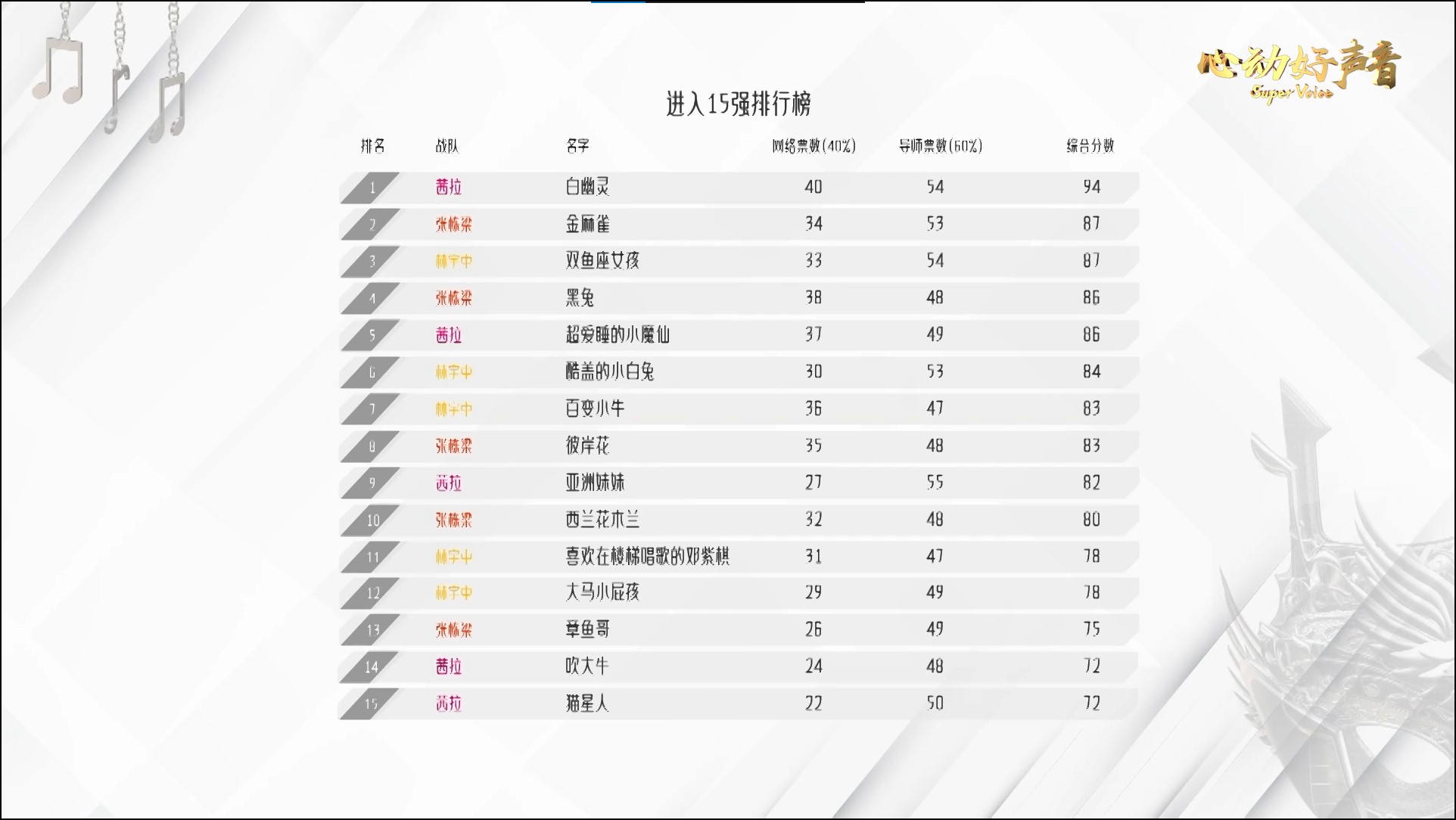 最后成功晋级张栋梁战队的“金麻雀”、“黑兔”、“彼岸花”、“西兰花木兰”及“章鱼哥”;茜拉战队的“白幽灵”、“超爱睡的小魔仙”、“亚洲妹妹”、“吹大牛”及“猫星人”;林宇中战队的“双鱼座女孩”、“酷盖的小白兔”、“百变小牛”、“喜欢在楼梯唱歌的邓紫棋”和“大马小屁孩”。