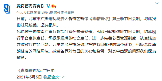 据中国媒体报导,《青春有你3》被民众举报相关存在问题,北京广电局不仅第一时间约谈爱奇艺相关负责人,要求落实广电行政部门有关管理规定,切实履行网路视听平台主体责任,完善节目管理制度,认真核查并整改存在的问题。而北京广电局也依据网路视听节目相关管理规定,责令爱奇艺暂停《青春有你3》节目录影。