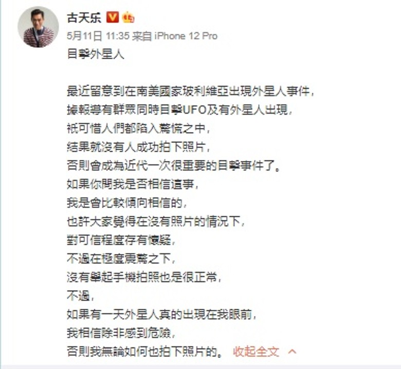 古天乐在微博发文表示,最近留意到在南美国家玻利维亚出现外星人事件,据报道有群众同时目击UFO及有外星人出现,“可惜人们都陷入惊慌之中,结果就没有人成功拍下照片,否则会成为近代一次很重要的目击事件了。”