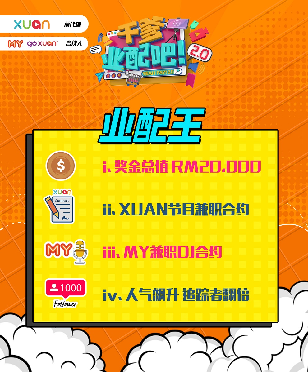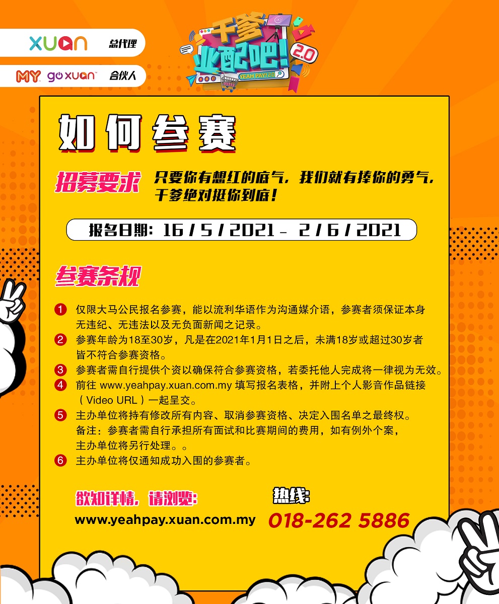参赛方法非常简单,所有在2021年1月1日之后满18岁或未超过30岁者,都有资格参加。你只需自行前往www.yeahpay.xuan.com.my填写报名表格,并附上个人影音作品链接(Video URL)一起呈交即可,委托他人完成者一律无效。即日起正式开放线上报名,截止日期为6月2日。
