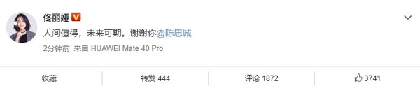 佟丽娅在微博感性写下:“人间值得,未来可期,谢谢你!”随后标注了男方,消息一出立刻登上热搜,震撼演艺圈。陈思诚随后也在微博发文表示,这段从2011年开始的恋情、2014年举行的婚礼,已正式在2020年划下句点,“故事告一段落。”