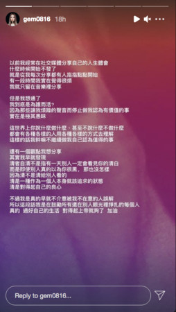 最后,邓紫棋也坦言,最后,写下这段话的确很需要勇气,因为很多人会开始猜测她发这些文字的原因,但她强调:“我是一个天天都在reflect(反思)自己生活的人,真的别担心。我极有可能只是坐在哪儿,看著蓝天,然后有所感悟。”