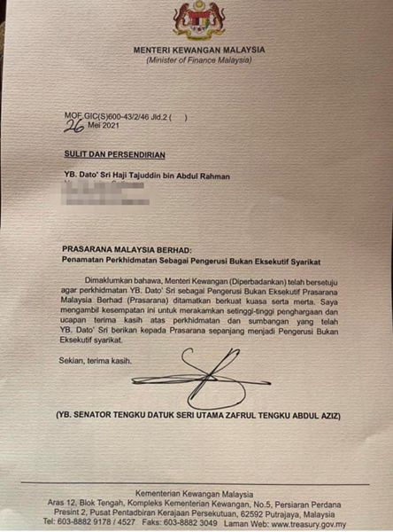 Astro Awani报道,财政部在志期5月26日(今日)的信函中表示,终止了达祖丁的Prasaran非执行主席职务,即时生效。