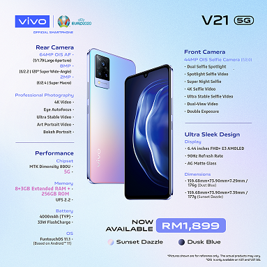 vivo旗下V系列智能手机推出V21 5G独家版,即日起在所有vivo概念店、网上购物平台出售,零售价为RM1899!