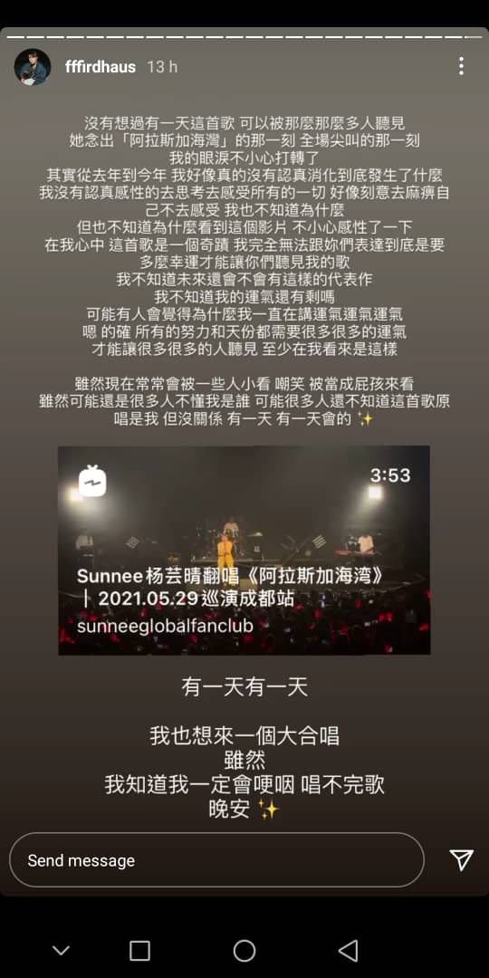 【特别报道】大马新晋唱作歌手菲道尔凭一首《阿拉斯加海湾》爆红, 近日“火箭少女010”成员Sunnee杨芸晴在个人巡演成都站翻唱了《阿拉斯加海湾》让菲道尔有感而发,在IG动态写下长文透露在歌曲爆红的这段时期内心的各种感受。
