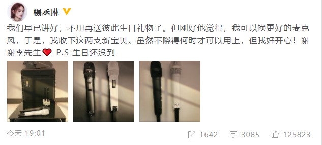 提前生日礼物!李荣浩贴心刻名麦克风送杨丞琳 2 Jun , 2021 | 娱乐前线 甜!杨丞琳在微博晒出一黑一白两支麦克风,并透露这是李荣浩提前送的生日礼物:“我们早已讲好,不用再送彼此生日礼物了。但刚好他觉得,我可以换更好的麦克风,于是我就收下这两支新宝贝。虽然不晓得何时才可以用上,但我好开心!谢谢李先生”。 之后,杨丞琳又转发自己微博,辟谣“话筒上刻了李荣浩和杨丞琳名字”的说法,她表示:“R.Y=Rainie Yang!是我本人,看到有好多人乱凑,我实在受不了”,浩哥真的太会了,还把麦克风给刻上老婆的名字! 分享