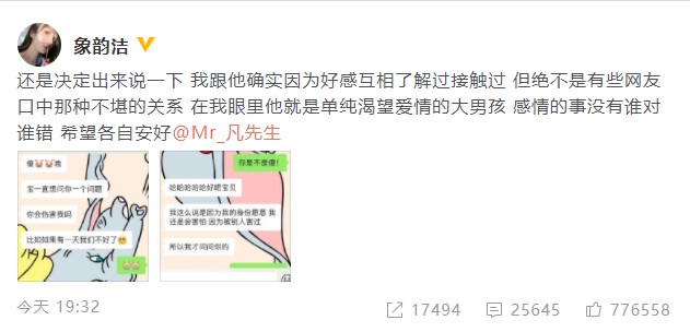 网红自爆与吴亦凡恋情 称因好感互相接触过 3 Jun , 2021 | 娱乐前线 网红象韵洁发文回应与吴亦凡恋情传闻,她表示:“我和他确实因为好感互相了解过接触过,但绝不是有些网友口中那种不堪的关系,在我眼里他就是单纯渴望爱情的大男孩,感情的事没有谁对谁错,希望各自安好”。 此前,有网友爆料称吴亦凡现任女友为网红象韵洁,而非一起去看电影的小怡同学。随后,她发文否认,称:“啥跟啥呀,传闻不可信,我单身,谢谢”。 分享
