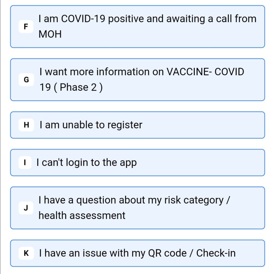 同时,你也可通过Helpdesk反映其他问题,像是家中长辈还未收到预约、App出现问题无法使用等等!Helpdesk的页面选项,分别有: