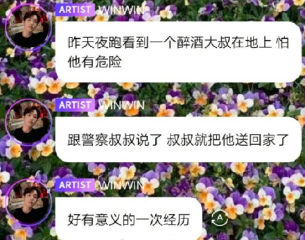 热心好青年!董思成夜跑遇醉汉躺地主动报警 6 Jun , 2021 | 娱乐前线 热心好青年无误!同是NCT和威神V成员的董思成在夜跑期间遇到醉汉躺地上,于是帮忙报警把醉汉给安全送回家了! 有网友在微博曝光董思成在泡泡软件与粉丝的聊天记录,董思成透露自己近日在夜跑时碰到一个醉酒大叔,担心对方有危险,便找到警察将这位大叔送回了家,还感叹这是一次有意义的经历。 粉丝们都大赞他的行为,认为“偶像明星平时确实应该多宣传多做一些正能量的事情,这样可以起到很好的引导作用”,热心行为也是大家的好榜样。 分享