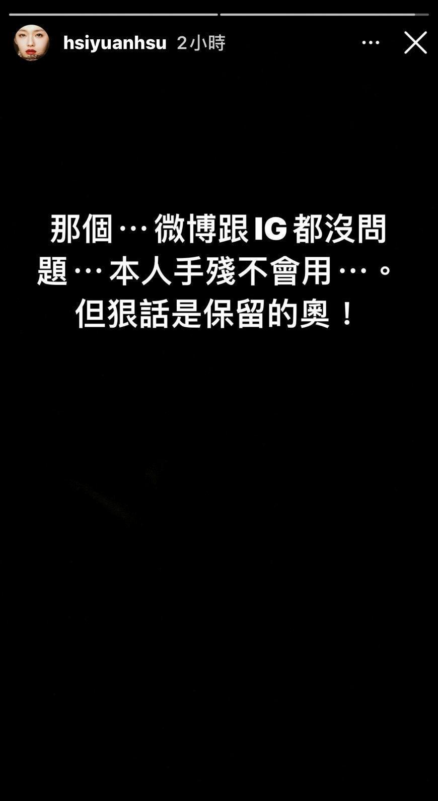 因为大S的私人IG鲜少更新,深夜突然发出限动、文字情绪激烈,立即就引起网民揣测。结果她稍早又发了一篇黑底白字文,写道:“那个…微博跟IG都没问题…本人手残不会用…。但狠话是保留的奥!”让大家一头雾水。