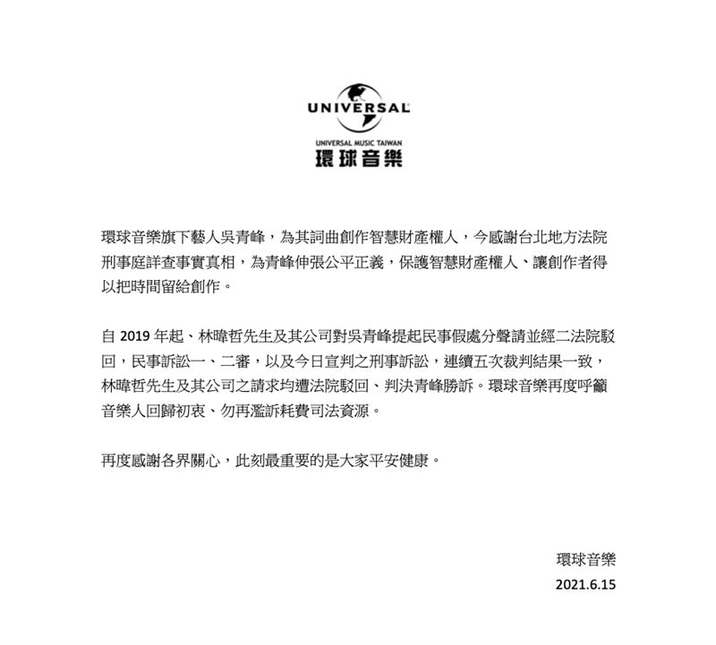 昨天判决结果出炉以后,吴青峰所属的环球音乐也发表乐声明,提到:“林暐哲先生及其公司对吴青峰提起民事假处分声请并经二法院驳回,民事诉讼一、二审,以及今日宣判之刑事诉讼,连续五次裁判结果一致, 林暐哲先生及其公司之请求均遭法院驳回、判决青峰胜诉。”希望对方勿再滥诉,耗费司法资源。