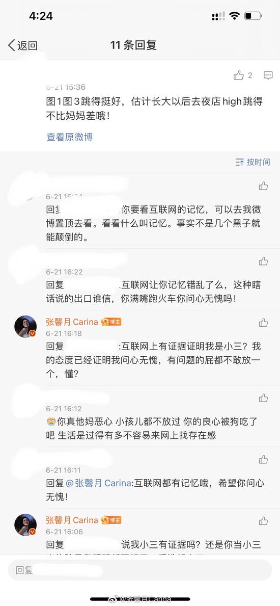 张馨月在超话发出一张评论区截图,在截图中,面对网友指责她为小三的评论:“小3上位的人说话就是拽。”张馨月回复表示:“说我小三有证据吗?还是你当小三当的脑子和眼睛都不好了,看谁都小三?”