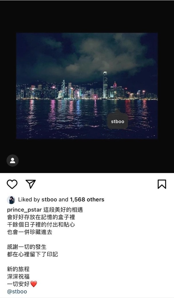 至于王子则上载了香港夜景照,并留言:“这段美好的相遇,会好好存放在记忆的盒子里,千馀个日子里的付出和贴心,也会一并珍藏进去,感谢一切的发生,都在心里留下了印记,新的旅程,深深祝福,一切安好。”