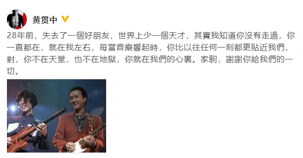 叶世荣零点准时在微博发文悼念好友:“怀念你家驹”,黄贯中则配上一张与黄家驹舞台旧照发文写:“28年前,失去了一个好朋友,世界上少一个天才,其实我知道你沒有走过,你一直都在,就在我左右,每当音乐声起时,你比以往任何一刻都更贴近我们,对,你不在天堂,也不在地狱,你就在我们的心里。家驹,谢谢你给我们的一切。 ”
