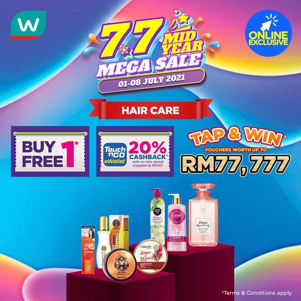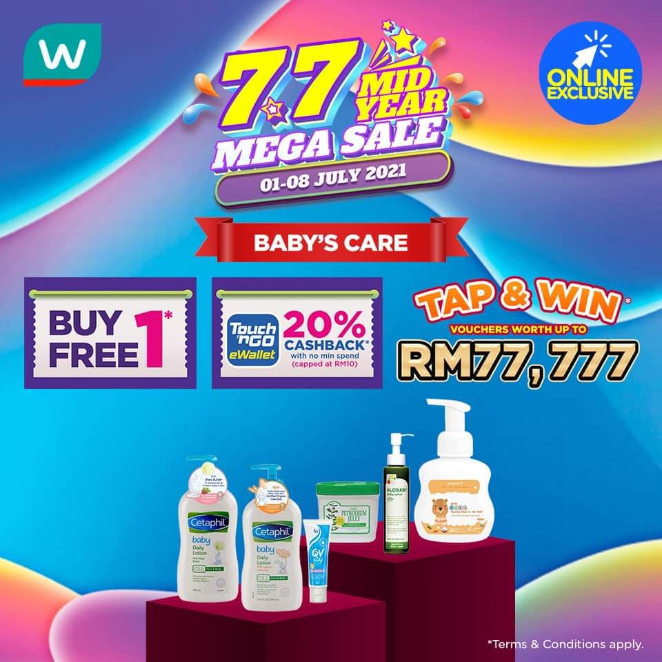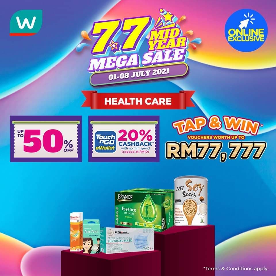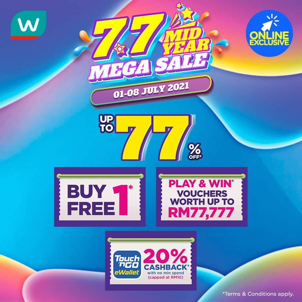 Watsons 7.7年中大促销真的诚意满满,促销竟然高达77%折扣,当中涵盖护肤、婴儿产品、保健和个人用品等等,真的超值得!无需最低消费,使用 Touch’n Go eWallet 付款,还可以获得 20% Cashback,最高可获 RM10!消费满 RM100 还可以获得免运费服务哦!