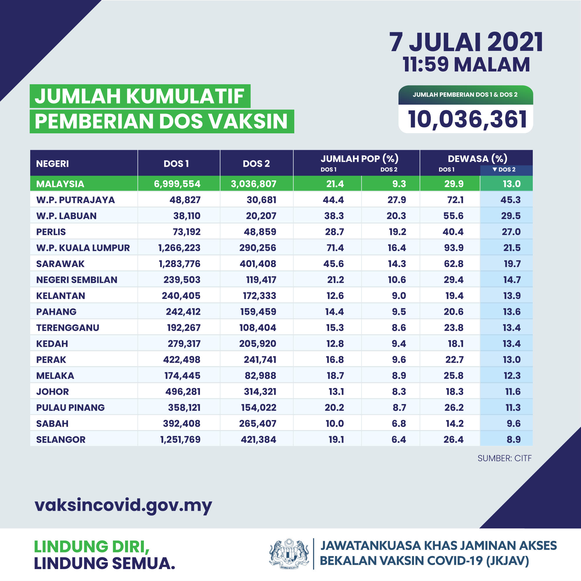 接种疫苗量大增! 8 Jul , 2021 | 民生关注, 民生百事 全国接种冠病疫苗剂量破千万大关! 根据疫苗供应特工队的数据,截至7月7日午夜11时59分,当局共施打了1003万6361剂疫苗。当中近700万剂是第一剂,300万剂是第二剂。 这施打的剂量令全国有近30%成人接种了疫苗,13%成人是完成了第二剂的疫苗接种。 在完成第二剂疫苗接种普及度方面,排行最高的地区是布城,有45.3%成人完成接种。最低的是雪州,仅有8.9%。 另一方面,昨日全国施打疫苗的力度也再大跃进,达到37万5842剂的新纪录。 分享