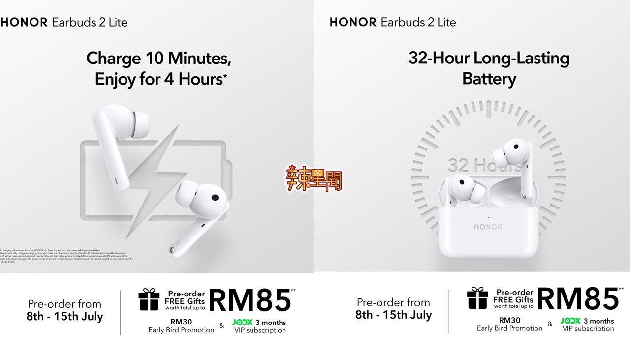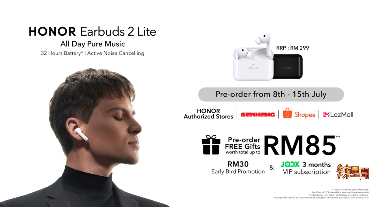 原价RM299,现在预购只需RM269就能到手!今(8日)起,点入Lazada HONOR 旗舰店、 Shopee HONOR官方商城、Senheng网店网购平台以及在全国HONOR 授权商店预购就能享有这项早鸟优惠。此外,现在预购还可享有3个月JOOX VIP会员服务价值RM56.70。优惠劵有限,先到先得!